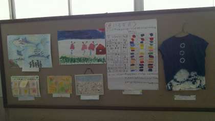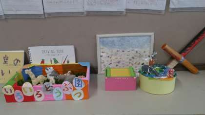 夏休みの間,子どもたちが頑張って取り組んだ作品を教室にかざっています。