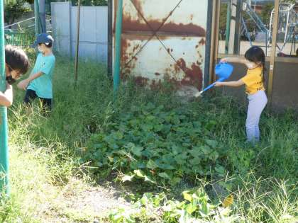 さつまいもにもみずをあげて, 10がつのしゅうかくをたのしみにしました。