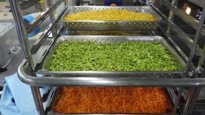 ひじきのソテーのにんじん,コーン,枝豆をスチームコンベクションオーブンで蒸してから,釜で炒めました。
