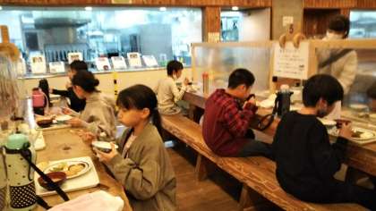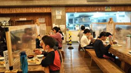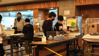 山の家での夕食です。エビフライやミートボール,ぎょうざに焼き魚など,子どもたちの好きそうなおかずでした。ここでもやはり黙食です。おかわりも,ほかの人がお茶碗などに触らないようにということで,ご飯おかわりマシーンがありました。5杯もおかわりしている子もいました。全員元気です。時々しぐれるので,プレイホールでキャンドルファイヤーをしています。今日のホームページの更新はこれで終了とします。