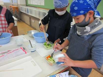 にんじん,ブロッコリー,キャベツをそれぞれのゆで時間に合わせて茹でて,フレンチソースを作って試食しました。子どもたちは「自分で作るとおいしい」と嬉しそうに食べていました。