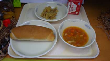あっさりしていておいしかったです。スパイシーチキンがとてもやわらかくて,ミネストローネもおいしかったです。」(4年児童)