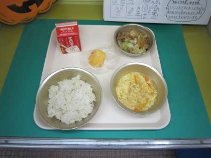 10月13日の給食は「麦ごはん、牛乳、回鍋肉(ホイコーロー)、中華コーンスープ、柿」です。ホイコーローは漢字で、鍋を回すと書きますが、これは一度鍋で炒めた肉を取り出して、次に野菜を炒めてそこへ肉を戻すという調理を表しています。味付けにはテンメンジャン、トウバンジャン、しょうゆでしています。「ホイコーローは野菜がシャキシャキしていて美味しかった。」「ホイコーローが美味しかったので、作り方を教えてほしいです。」と好評でした。
