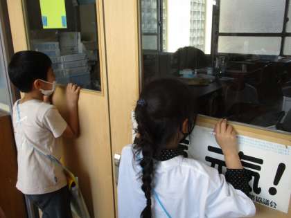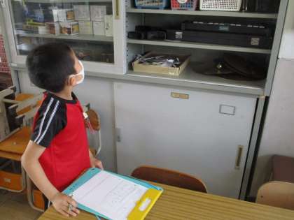 そして,「一年生が学校探検をするときに案内カードを作って教室にはろう!」と,今度は,自分が担当する教室について詳しく調べに行きました。