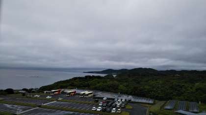 おはようございます。子どもたちは、全員元気です。今雨は、やんでいます。写真は、ホテルの前の海です。