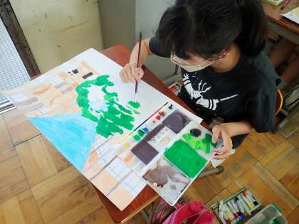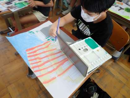 GIGA端末を見ながら,丁寧に色塗りをしています。
