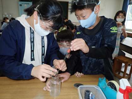 石灰水もガラス棒につたわらせて,注ぐことができました。