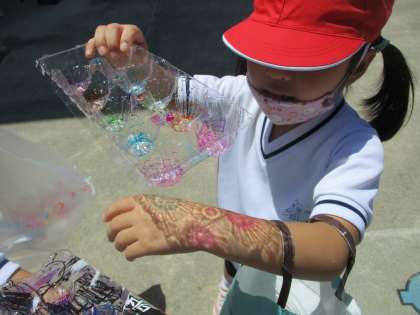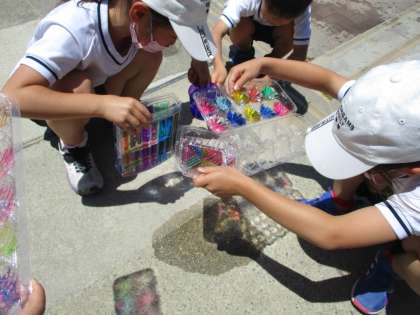 プラスチックの様々な形の材料に色を塗って光を通しながら,できた形や色を友達と合わせてみたり,自分の体に映してみたりと,いろいろな楽しみ方ができました。