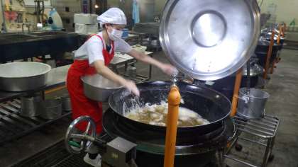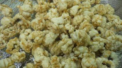 はもは「梅雨の水を飲んで味がよくなる」と言われています。ちょうど祇園祭のころに旬をむかえるので,祇園祭は「はも祭り」とも言われています。今日は,しょうが・料理酒・塩・淡口醤油で下味をつけて,米粉とかたくり粉をまぶし揚げました。