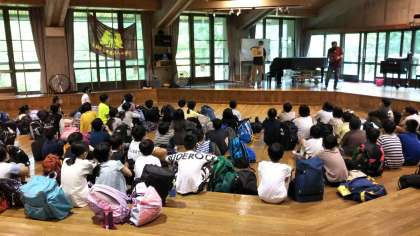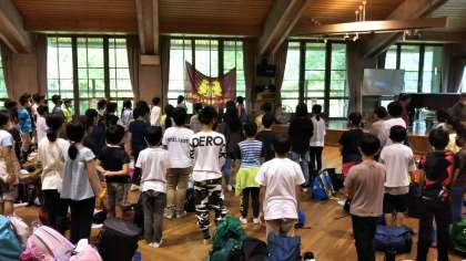 花背山の家に到着しました。小雨が、時々降っています。入所式をしました。
