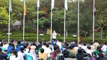 退所式をして、予定通り2時30分に山の家を出発しました。まもなく鞍馬寺前を通過します。