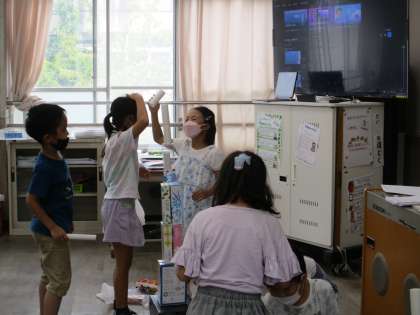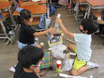 生活の学習では、お家からペットボトルやラップの芯などいらなくなったものを使っておもちゃ作りをする学習をします。どんな遊びが面白いか、子どもたちが持ってきたものを持ち寄ってたくさんあそんでみました。積み上げたり、ジェンガのように抜いてみたり、的を作って当ててみたり…いろいろな遊びが発見できました。