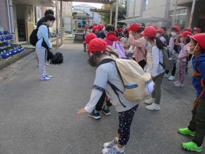 学校の松の木の前に集合し、今日お世話になる先生方にあいさつをしました。