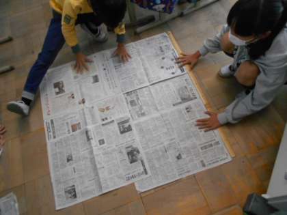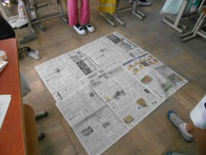 できあがった1平方メートルの新聞紙を持って教室を出ると、色々なものの大きさを調べてみました。「ドアは2平方メートルあるかなあ。」「廊下の本棚は1平方メートルよりほんの少し小さい。」などと、色々な発見がありました。