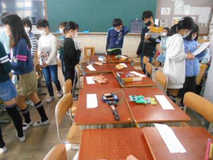 今日はみんなの作品を鑑賞する学習です。早く見たかったようで、素敵な作品が教室に並びました。