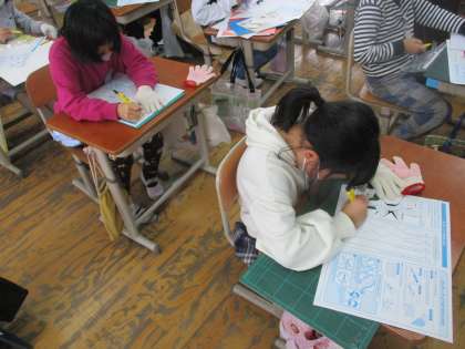 図画工作科「まどから こんにちは」の学習でカッターナイフを使って窓を切る練習をしました。はじめは,まっすぐ切ることが難しかった子どもたちですが,自分に合った持ち方を選んだり,ゆっくり少しずつ切り進めたりしながら,上手に窓を切ることができました。
