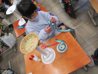 紙皿と筒を使って,転がるおもちゃを作りました。