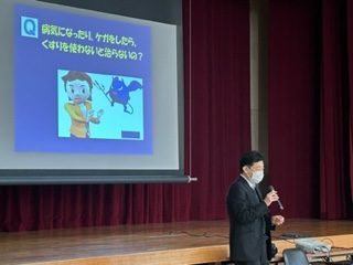 学校薬剤師である田中先生に「お薬について知ろう」というテーマでお話ししていただきました。毎年この時期に5年生と6年生に「薬物乱用防止教室」としてお薬について教えていただいています。5年生は「役に立つ薬の話」として薬の正しい使い方として7つの約束を教えていただきました。その中でも一番大切なことは「薬はもらったり、あげたりしてはいけない」ということです。これは6年生で教えていただく「役に立たない薬の話」のキーワードになります。