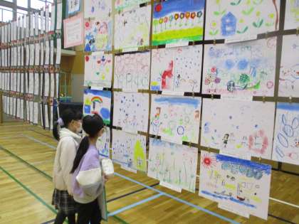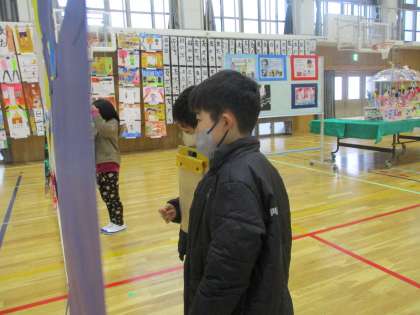 校内作品展に展示されている作品を見に行きました。各学年が様々な作品を展示していて「この作品すごい!どうやって作ったんだろう。」「この習字,めっちゃきれい。」と,たくさんの感想を出していました。特に,年上のお兄さんお姉さんの作品を見て,「私たちもこんな作品を作ってみたいな。」と,わくわくしている様子でした。