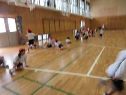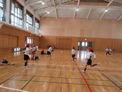 しっかり柔軟体操をしたあと、スキップやウサギじゃんぷをして楽しみました。