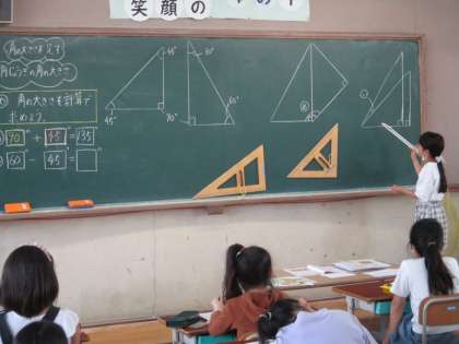 算数科「角とその大きさ」の学習で、角の大きさを計算で求めました。前時に調べた三角定規の角の大きさをもとにして、角度を足し算や引き算で求めました。