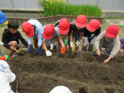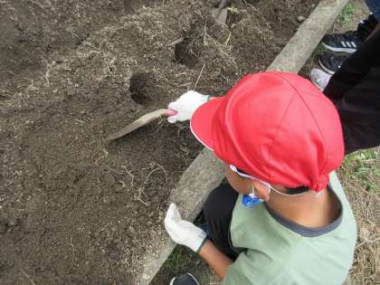 芽が出ているほうを上にして、畑の穴に一つずつ植えていきました。