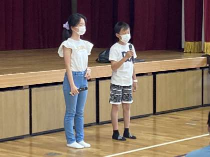 はじめの言葉の2人は、修学旅行のめあてやマナーについて、しっかり話していました。