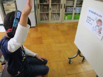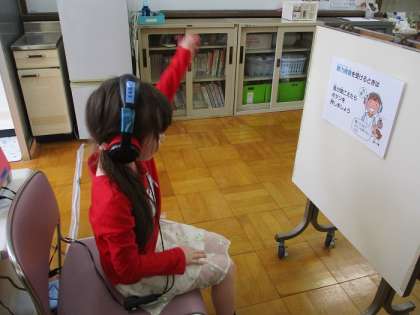 聴力検査の様子です。検査の方法をしっかり聞いて、約束を守って受けていました。