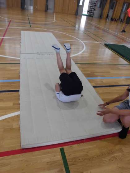 4ねんのたいいくは マットうんどうを がんばっています。