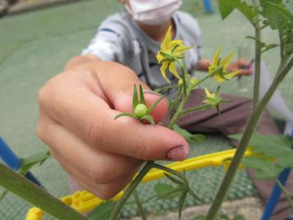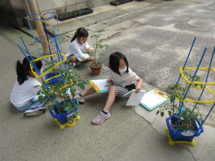 「バナナの皮がむけたみたいな花や!」「花の大きさは2センチメートルくらい!」と国語で学んだことを生かして観察しました。小さい実がついている子どもたちも!たくさん実が付くのが楽しみです