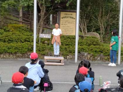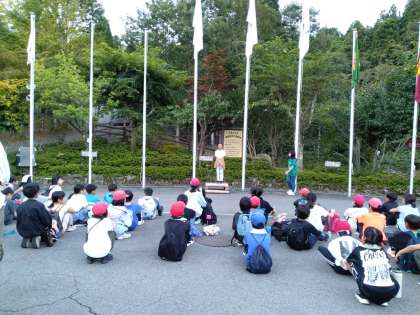 朝の集いを本館前広場で行いました。子どもたちは、全員元気です。