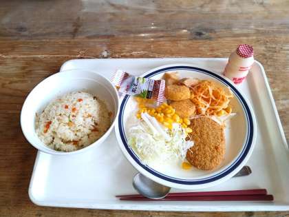 今日の昼ご飯は、炒飯とカレーコロッケ等のおかずでした。これから、準備をしてゴジ谷ハイクに出かけます。