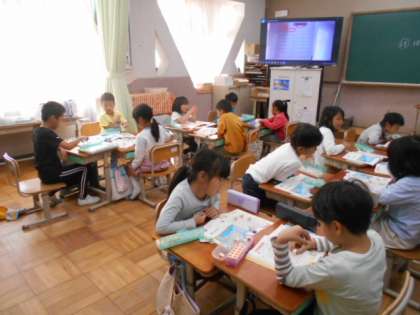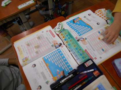 くりあがりのあるたしざんに挑戦しています。たくさんあるカードの中から答えが11になるもの.13になるもの、16になるもの…と探していきました。