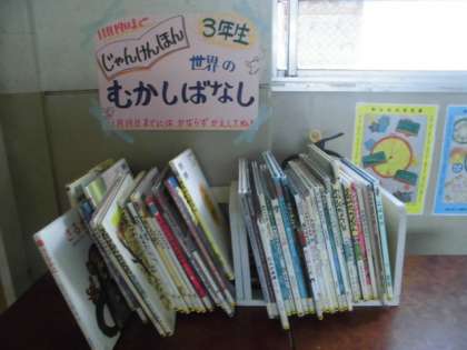 3年生教室前に昔話の関連図書を置いてくださいました。