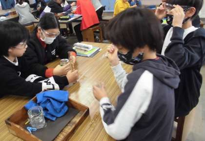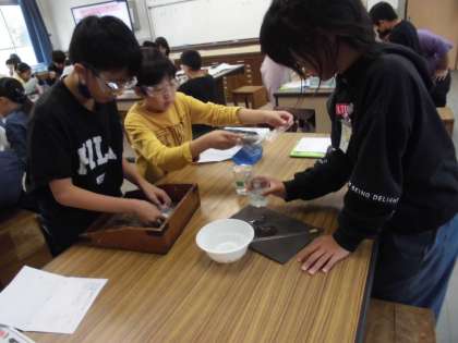 理科の実験で、溶け残った水溶液を使い、さらに物を溶かす方法を試しました。