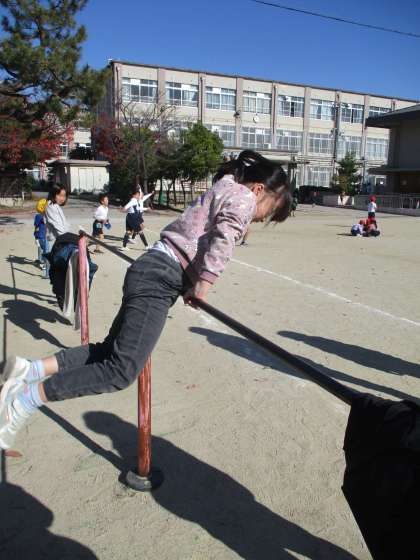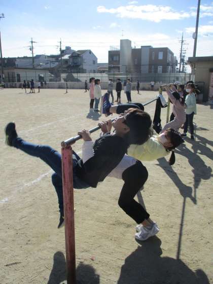 てつぼうがすきなひとがおおく、みんなで てつぼうの れんしゅうをしています。