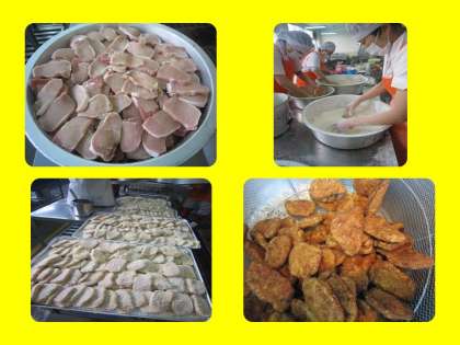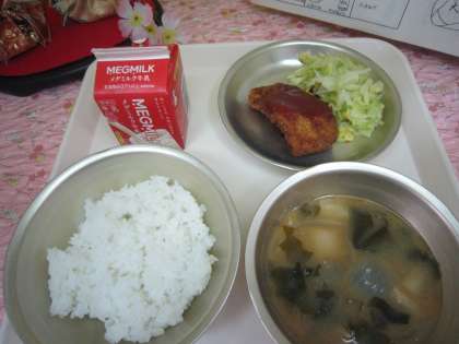 3月13日の給食は少し早い卒業お祝い献立の「ごはん、牛乳、トンカツ、ソティ、みそ汁」です。トンカツは豚ロース肉を1枚1枚塩・こしょうで味付けして、小麦粉・卵・パン粉の衣をつけて油で揚げました。「外がサクサクしていて、中は柔らかくて美味しかった。」「ソースがトンカツにとっても合っていた。」「お祝いの日だけでなく、何回も出してほしい。」などとても人気がありました。