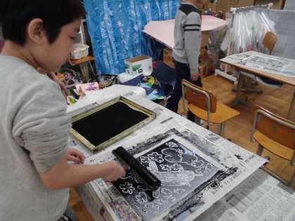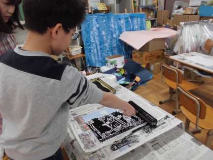 3くみは はんがに インクをつけました。