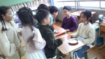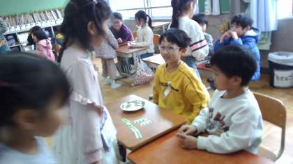 簡単な英語のやりとりをして、色シールをもらう活動をしました。
