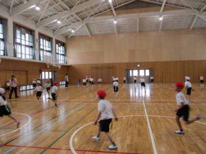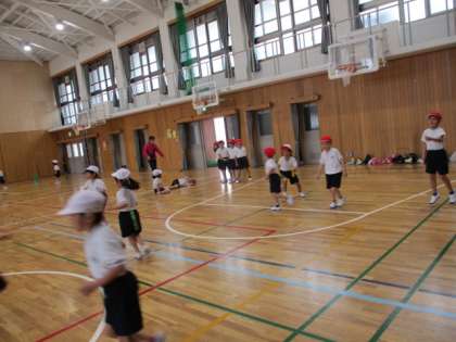 体育の学習では、ボール運びとしっぽとりの2つの遊びをしました。