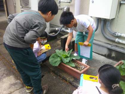 教室の外に出て、生き物をさがし観察しました。じっくり見る、音を聞く、長さを測る、触ってみる、観察して見つけたことや分かったことを記録しました。