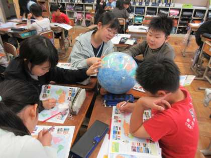 世界の中でどのような国があるのか、地球儀で探していきます。