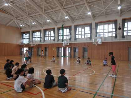 この間、体育館を使ってスーパーボールを紙コップに投げ入れるゲームをしました。