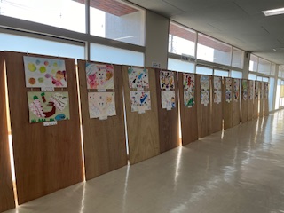 9/7(土)に島津アリーナで2024体育館フェスタが行われました。当日は、体育館の施設が無料開放され、他に物品販売、近隣の小中学校の美術作品の展示、地域の方がつくられた作品の展示がありました。朱雀第八小学校は、1・2年生の作品が展示されました。図工の時間に描いた作品が廊下一面に展示されました。