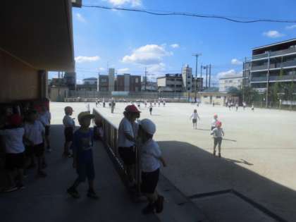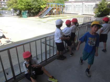 体育の時間、1年生のみんなはこまめに休憩をとっていました。