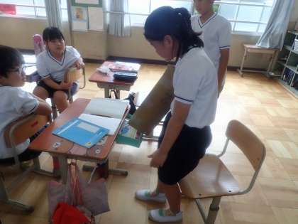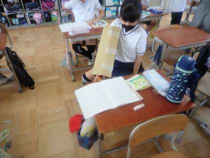 肘が曲がらないので、いつもより取りにくい様子の子どもたち。