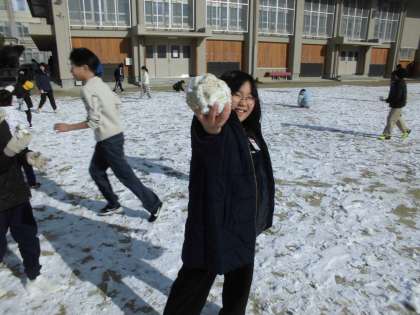中間休み、運動場に雪が積もっていました!