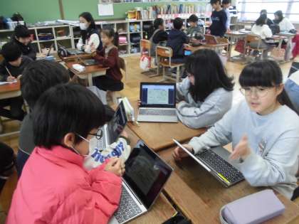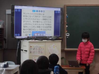 調べたことを班で伝えたり、全体で発表したりしている様子です。