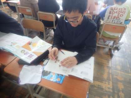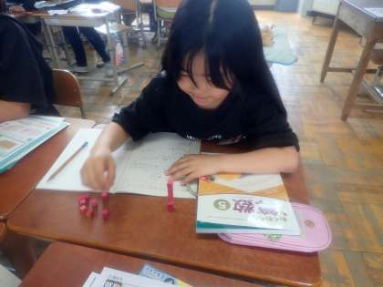 写真は、1㎤の積み木を使って色々な形を作っている様子です。