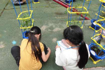 生活科の学習で育てている野菜の観察をしました。「かんさつ名人」を目指して、色や形、大きさ、数、におい、触った感じなどを調べていました。